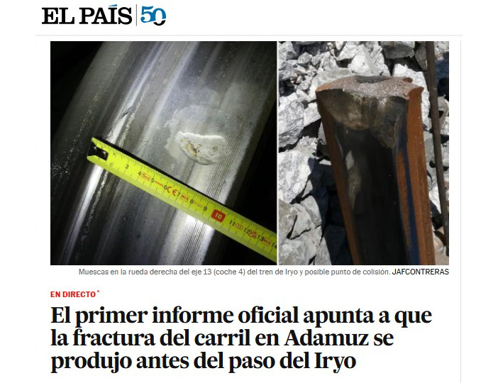 La vía ferroviaria por la que circulaba el Iryo centra las investigaciones para tratar de esclarecer qué ocurrió en el siniestro ferroviario de Adamuz, donde murieron 45 personas. El primer informe oficial de los investigadores maneja la hipótesis de que el carril derecho “estuviese fracturado” antes del paso del tren Iryo. Este primer informe oficial de la Comisión de Investigación de Accidentes Ferroviarios (CIAF) explica que cuando un carril está roto, el peso del tren hace descender la parte previa a la rotura, y la rueda acaba chocando con el escalón que se ha formado delante. Las ruedas delanteras de los bogies de los coches 2, 3 y 4 del Iryo muestran marcas compatibles con ese escalón.