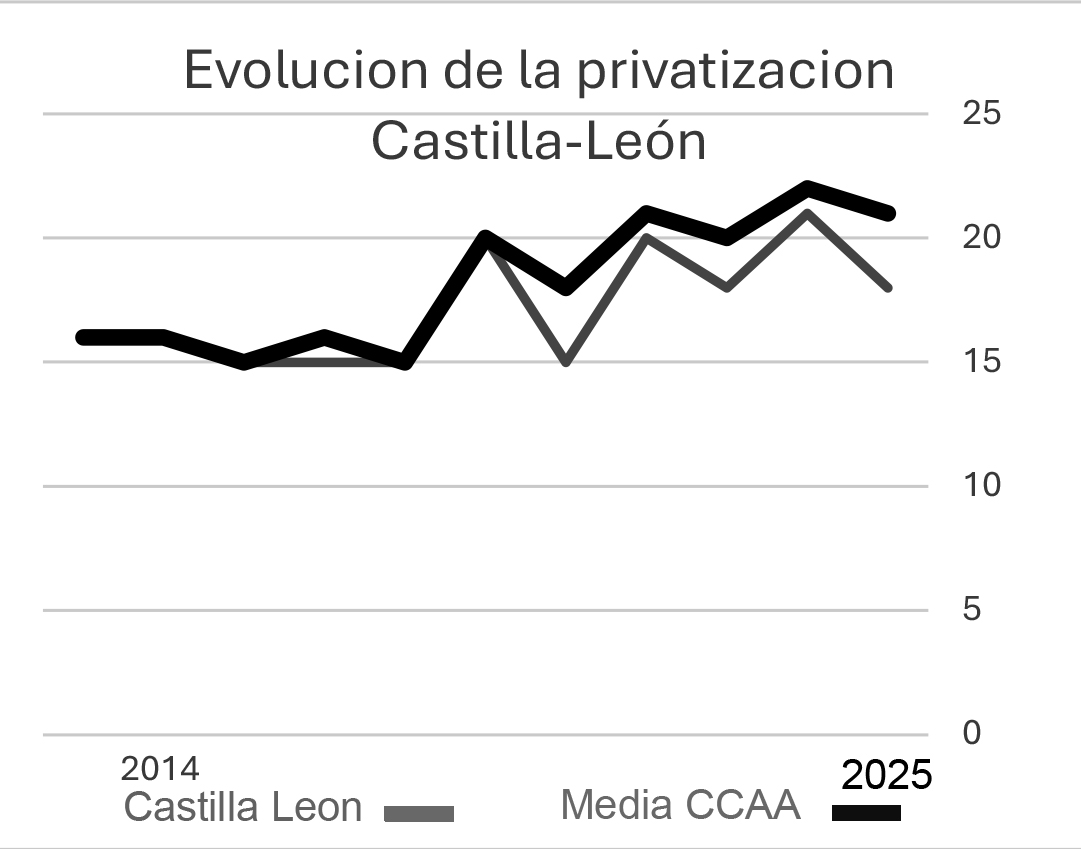 En el gráfico apreciamos la evolución de la privatización de los servicios sanitarios públicos de la Comunidad en los últimos 11 años siguiendo una tendencia creciente como en el resto de las comunidades autónomas