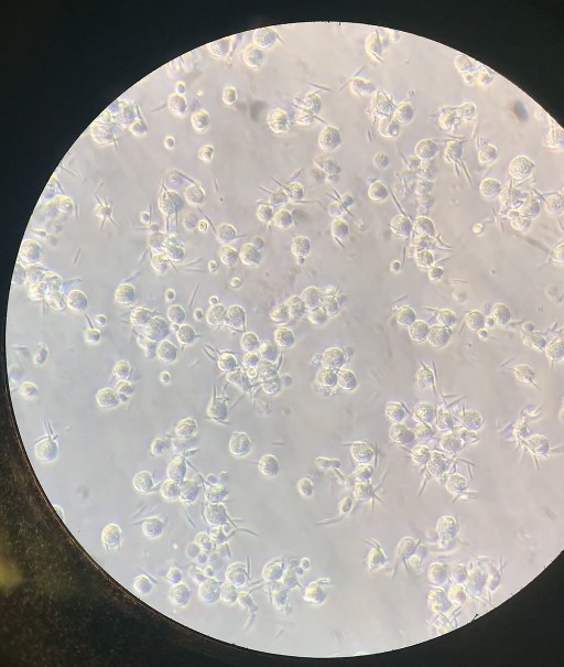 Imagen tomada con un microscopio óptico invertido a 40 aumentos de células de perro siendo infectadas por Leishmania infantum