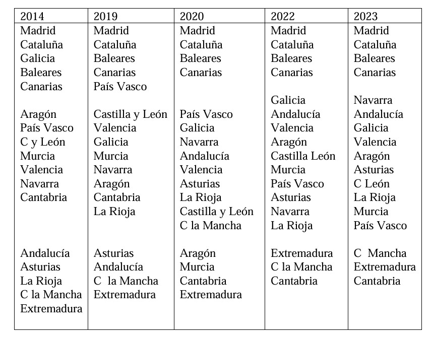 • La tabla siguiente recoge la clasificación en 4 informes, el primero, el de este año y los de 2019,2020 y 2022, (en los 5 primeros años se analizaron las mismas variables, en 2019 se incluyeron 2 mas, en 2020 no se pudo incluir una, en 2022 vuelve a recuperarse una más, aunque proveniente de una fuente distinta y en 2023 se mantienen las mismas variando la fuente en 2 de ellas), observándose que las 4 primeras CCAA con más privatización en 2022 ya estaban en 2014 en este grupo donde han permanecido con algún cambio de posición, las 2 primeras son las mismas (Madrid y Cataluña) en todos los informes, y las 4 primeras son idénticas en los 4 últimos informes.