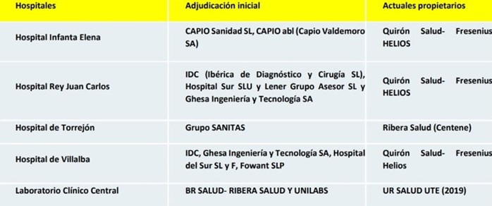 Esta privatización corrió a cargo del consejero de Sanidad, Manuel Lamela, conocido por la persecución de los médicos del hospital Severo Ochoa (entre ellos, el doctor Luis Montes) y el encargado de adjudicar estos contratos. Posteriormente, en 2010 entró a formar parte del Consejo de Administración de una de las empresas adjudicatarias de estos contratos, el Hospital del Tajo, cuyo propietario estuvo además investigado por la Gürtel.