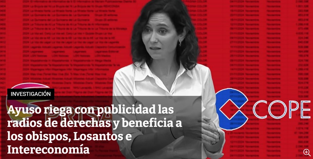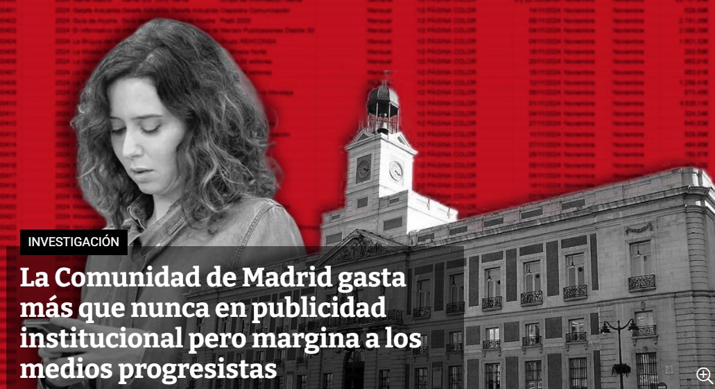 - Más de medio millón de euros en publicidad para la web de OK Diario, el digital de Eduardo Inda. Casi 300.000 euros para Libertad Digital, el medio de Federico Jiménez Losantos. Otros 67.000 en campañas para EDA TV, de Javier Negre. Son algunos de los gastos del Gobierno de Ayuso en publicidad institucional en 2023.Solo en esas tres webs la Comunidad de Madrid gastó casi 900.000 euros el año pasado. Tres ejemplos que demuestran cómo el Gobierno madrileño infla con su reparto de publicidad institucional a la derecha mediática y a los digitales conservadores y ultras, tal y como revela la investigación que Público está difundiendo en los últimos días.