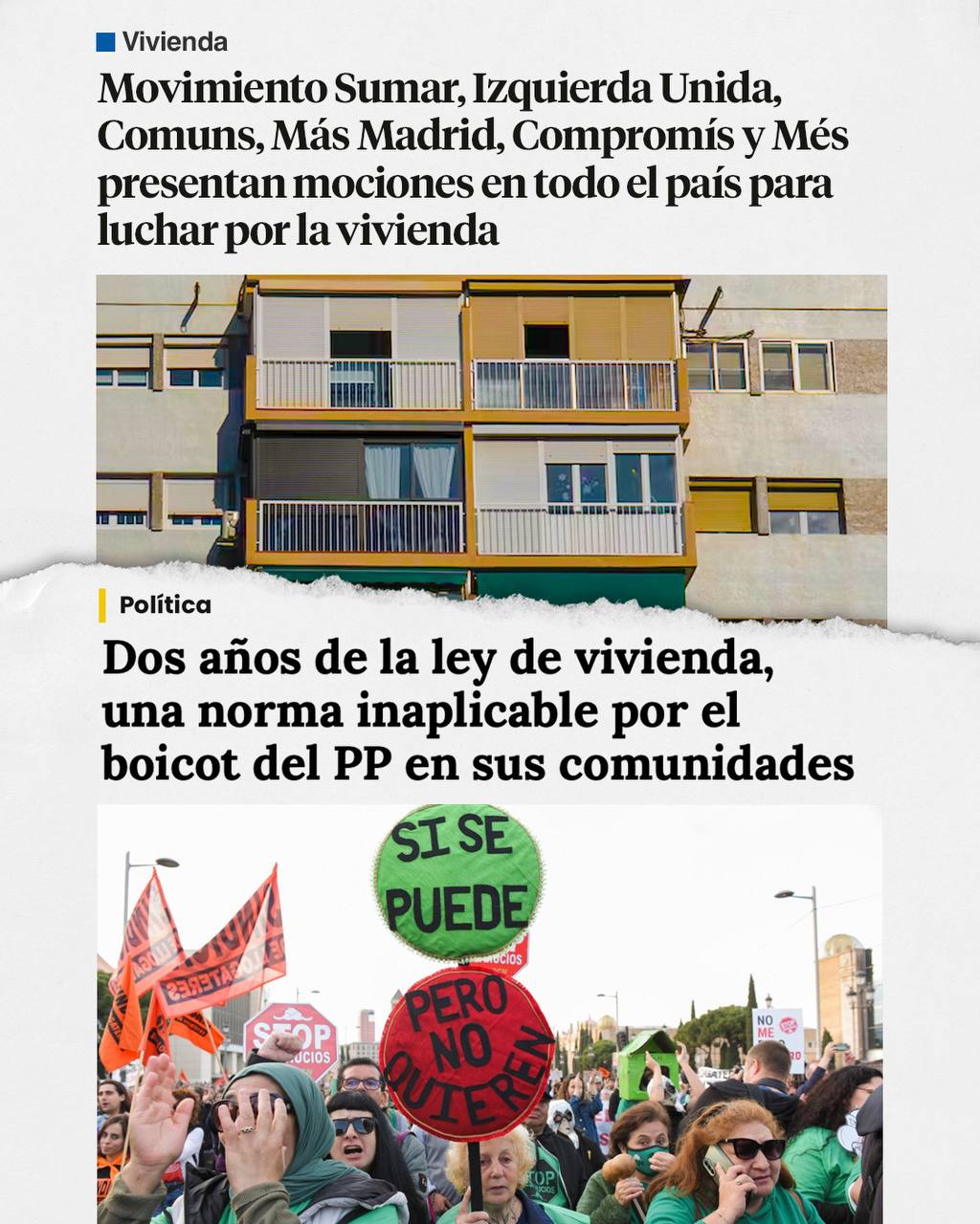 Movimiento Sumar, Izquierda Unida, Comuns, Más Madrid, Compromís y MES presentamos mociones en todos los rincones del país para hacer frente a la crisis de la vivienda y exigir que se aplique la Ley de Vivienda.